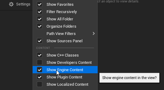 Once you click settings, enable the "Show Engine Content" feature if you are using the Epic Games Launcher to install or Show plugin content if you installed it directly to your project. Most users will be using the Epic Games Launcher version.